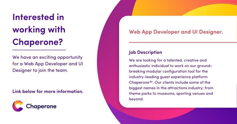 We are looking for a talented, creative and enthusiastic individual to work on our ground-breaking modular configuration tool for the industry-leading guest experience platform, Chaperone. Our clients include some of the biggest names in the attractions industry; from theme parks to museums, sporting venues and beyond.